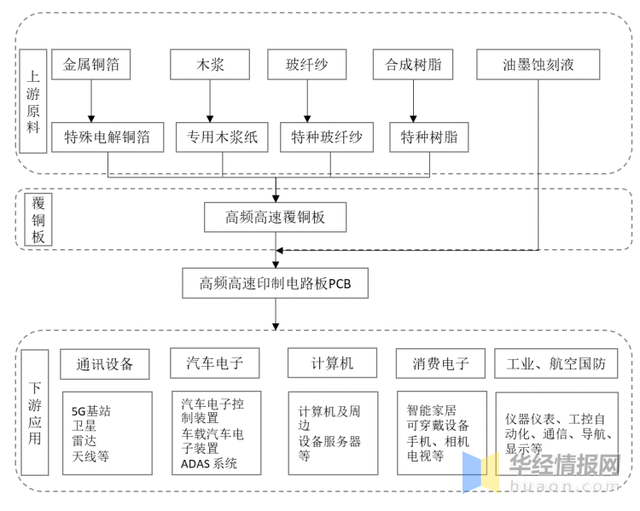 高頻高速覆銅板行業(yè)產(chǎn)業(yè)鏈上游為原材料,包括金屬銅箔、木漿、玻纖紗、合成樹脂和油墨刻蝕液;下游為各類電子產(chǎn)品,包括消費電子、汽車電子、計算機、通訊設備和工業(yè)、航空國防。