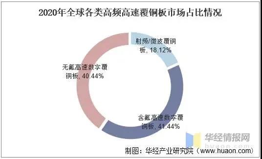 2020年全球高頻高速覆銅板市場為28.86億美元,同比增長17.03%,其中,射頻/微波覆銅板2020年銷售額為5.23億美元,預計2024年產(chǎn)值達到8.53億美元;高速覆銅板中,含氟高速覆銅板2020年銷售額為11.96億美元,無氟高速覆銅板2020年銷售額為11.67億美元,同比增長32.86%,增速最快,預計2024年高速覆銅板總產(chǎn)值28.3億元。
